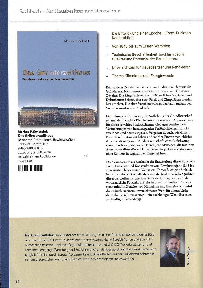 Das Gründerzeithaus beschreibt die Entwicklung dieser Epoche in Form, Funktion und Konstruktion vom Revolutionsjahr 1848 bis zum Ausbruch des Ersten Weltkriegs. Dieses Buch gibt Einblick in die technische Beschaffenheit und die bauklimatische Qualität dieser wertvollen Historischen Gebäude. Es zeigt aber auch das wirtschaftliche Potential auf, das in dieser beständigen Bausubstanz ruht. Im Zeitalter von Klimakrise und Energiewende wird dieses Buch zu einem unverzichtbaren Werk für alle an Gründerzeithäusern Interessierten – ein nachhaltiges Werk über einen nachhaltigen Gebäudetyp.